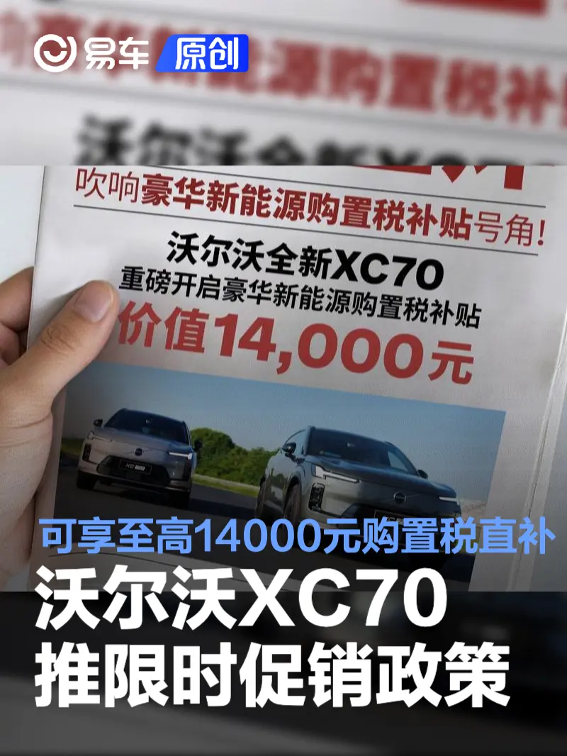 易车讯 1月1日,沃尔沃官方宣布旗下超级混动车型沃尔沃全新XC70于2026年1月1日至31日推出限时促销政策,包括高达14,000元的购置税直补及覆盖购车、用车、养车全周期的“新年四重豪礼”,降低广大消费者的购车门槛。