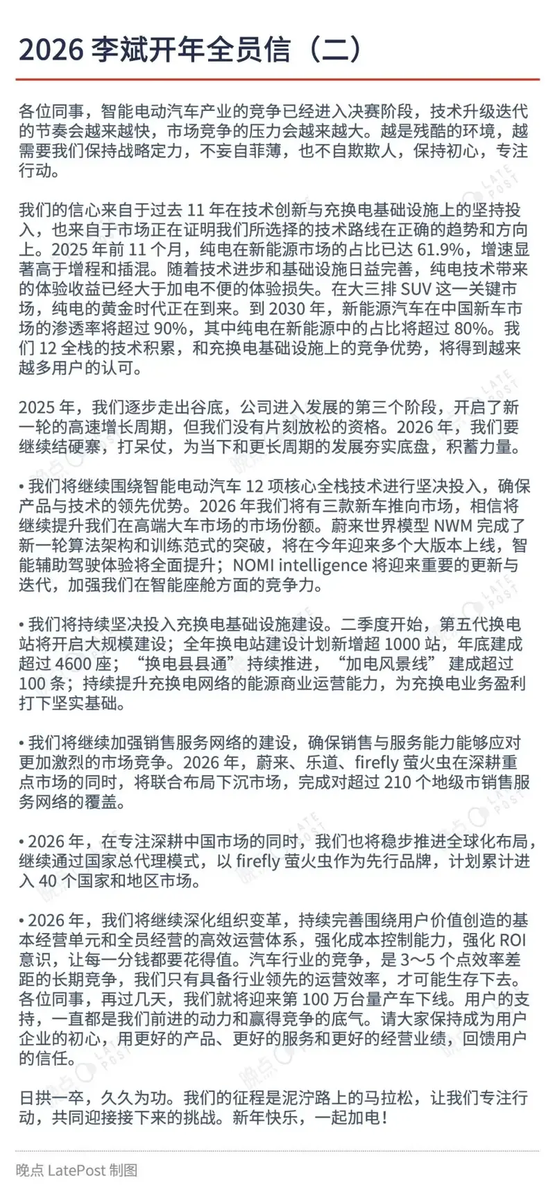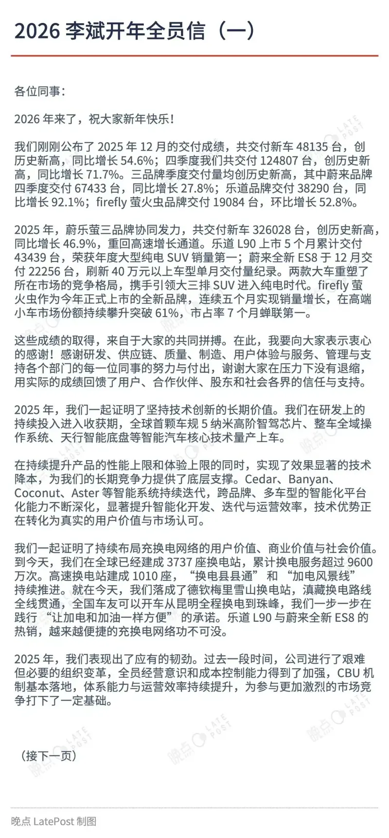 易车讯 1月2日,我们从“晚点Auto”获悉,蔚来创始人、董事长、CEO李斌发布《2026开年全员信》。在信中李斌肯定了蔚来过去一年取得的成绩,并表示2026年将坚决投入全栈技术、坚决投入充换电基础设施建设、继续加强销售服务网络建设、稳步推进全球化布局以及将继续深化组织变革。2026年蔚来将推出三款新车,新建换电站超1000站。
