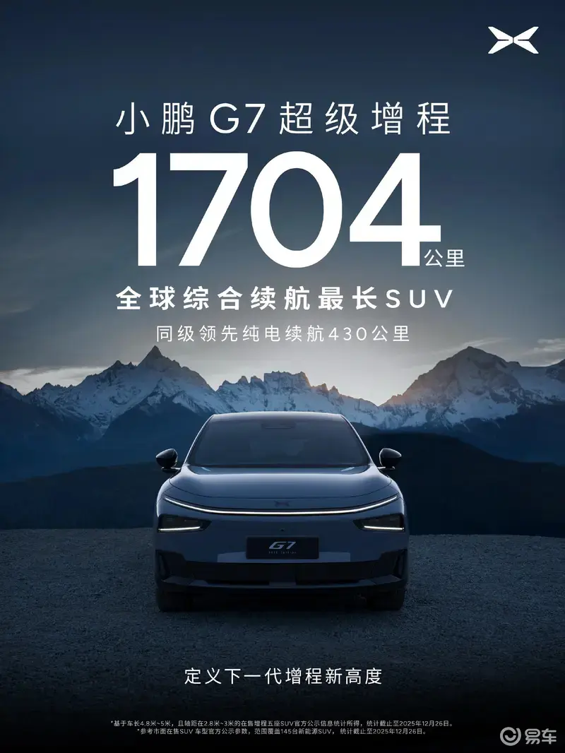 易车讯 1月2日,小鹏汽车宣布2026款小鹏P7+及小鹏G7超级增程正式发运全国232个城市。预计2款新车将于近期上市销售。