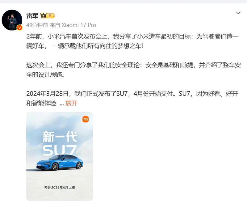 雷军表示,2年前,小米汽车首次发布会上,我分享了小米造车最初的目标:为驾驶者们造一辆好车, 一辆承载他们所有向往的梦想之车!