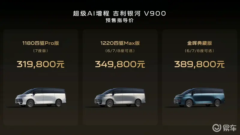 易车讯 1月7日,吉利银河V900正式开启预售,预售价31.98-38.98万元。新车定位为大型MPV,车长超过5.3米,采用1.5T增程式动力。