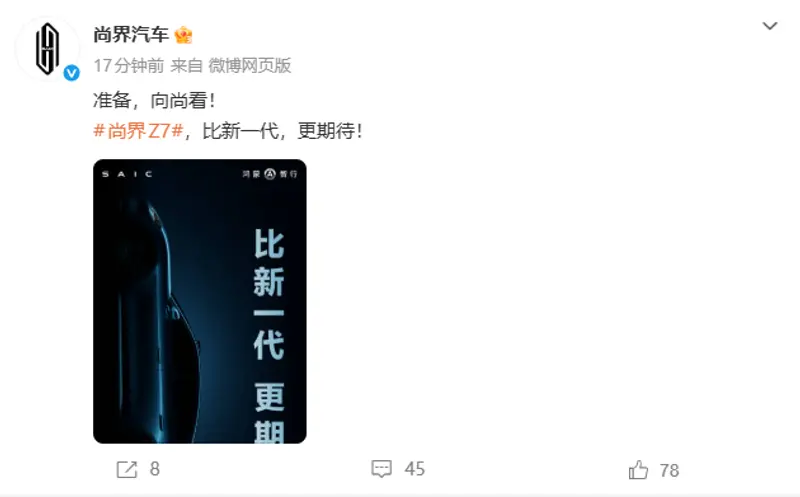 尚界全新轿跑车Z7预告图公布 将于春季发布 2026-01-07 18:28 来源:汽车产经网 作者:易车原创报道 举报 易车讯 1月7日,尚界正式公布旗下全新轿跑车定名为Z7,并发布了首张预告图。作为尚界旗下的第二款新车,尚界Z7将与尚界H5行成轿车与SUV的产品矩阵,共同冲击20万级新能源汽车市场,将于春季正式发布。 从预告图来看,尚界Z7采用流畅的溜背造型与超宽车肩设计,营造出极强的视觉张力。细节方面,新车加入了半隐藏门把手,激光雷达与辅助驾驶小蓝灯,并将搭载华为乾崑智驾、鸿蒙座舱等配置。