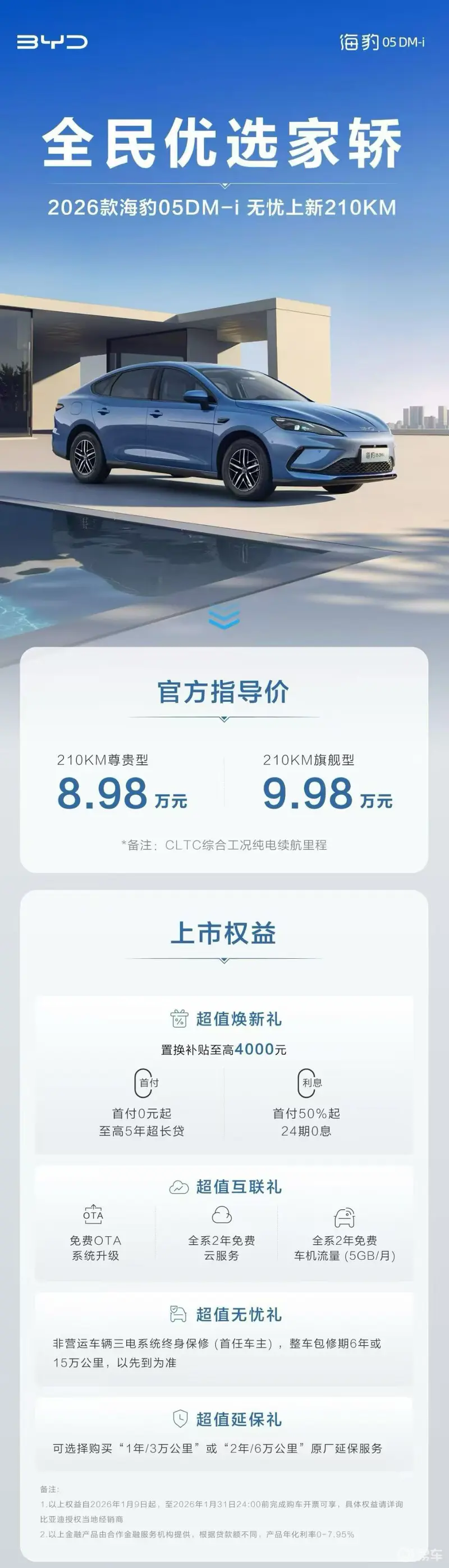 易车讯 1月9日,比亚迪2026款海豹05DM-i与海豹06DM-i超享版分别加推两款纯电续航高达210km的全新车型,其中,2026款海豹05DM-i加推210KM尊贵型、210KM旗舰型,官方售价8.98-9.98万元;海豹06DM-i超享版加推210KM尊享型、210KM旗舰型,官方售价11.68-12.68万元。
