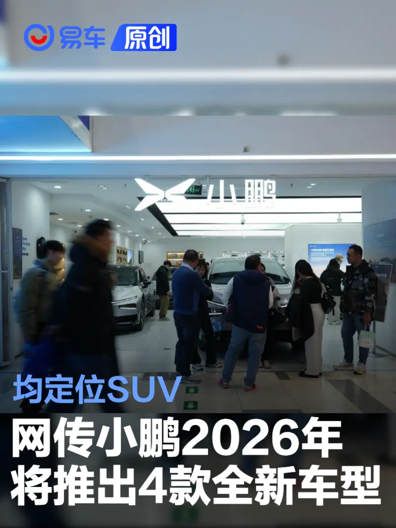 据36氪汽车报道,4款全新车型分别为小鹏G01、小鹏G02以及小鹏MONA的D02和D03,四款新车均定位SUV车型。推出的4款全新车型为小鹏G01、小鹏G02、小鹏MONA两款SUV D02和D03,均是SUV车型。此外,小鹏汽车近期在内部战略会上透露,2026年全年销量目标55-60万辆。