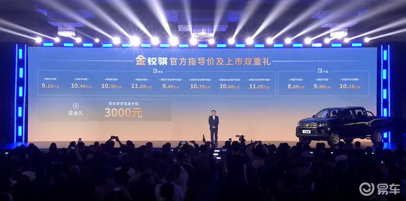 动力方面,金锐骐柴油版车型搭载源自雷诺的M9T 2.3T涡轮增压柴油发动机,最大功率108千瓦,最大扭矩350牛·米,匹配5速手动或8速自动变速箱;汽油版车型搭载2.4L自然吸气发动机,最大功率116千瓦,最大扭矩240牛·米,匹配5速手动变速箱。官方数据显示,柴油版车型的百公里综合油耗为6.8升。此次上市还同步推出了CNG(压缩天然气)双燃料车型。该车型基于汽油长箱版打造,搭载2.4L发动机,可使用汽油和天然气两种燃料,在CNG模式下最大功率为101千瓦,最大扭矩206牛·米。车型分为单140L气瓶和140L+40L双气瓶两种规格,旨在为高频运营用户提供更低成本的燃料选择。
