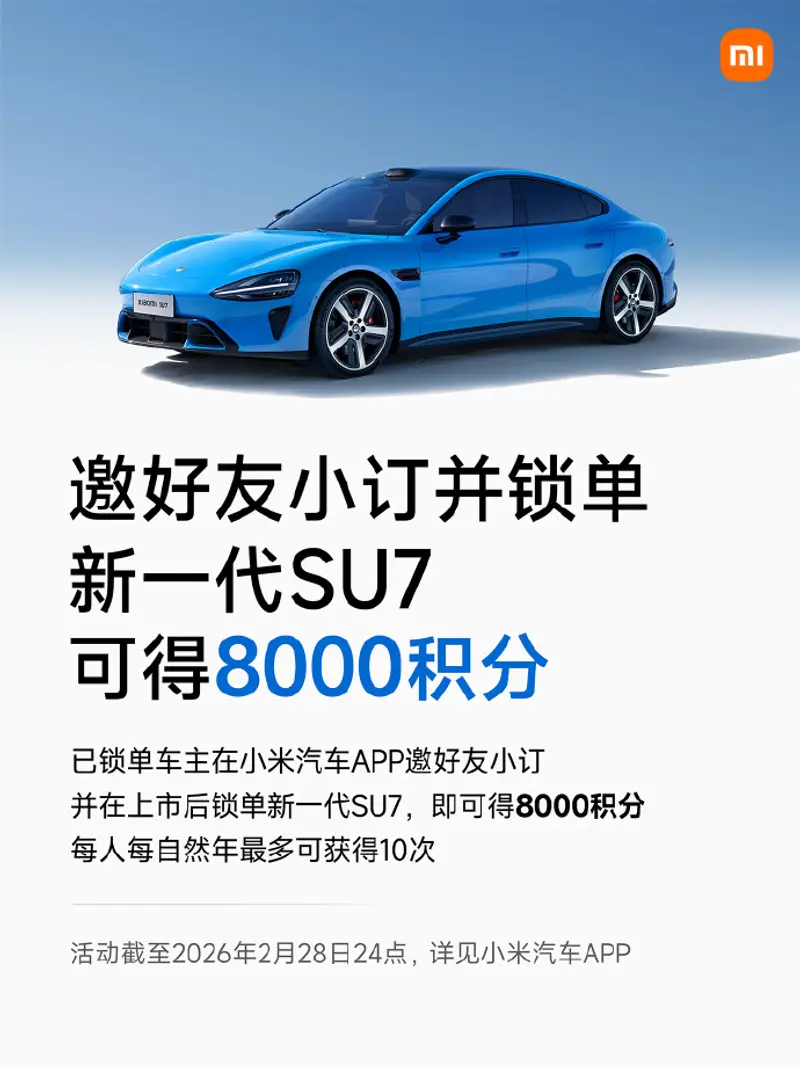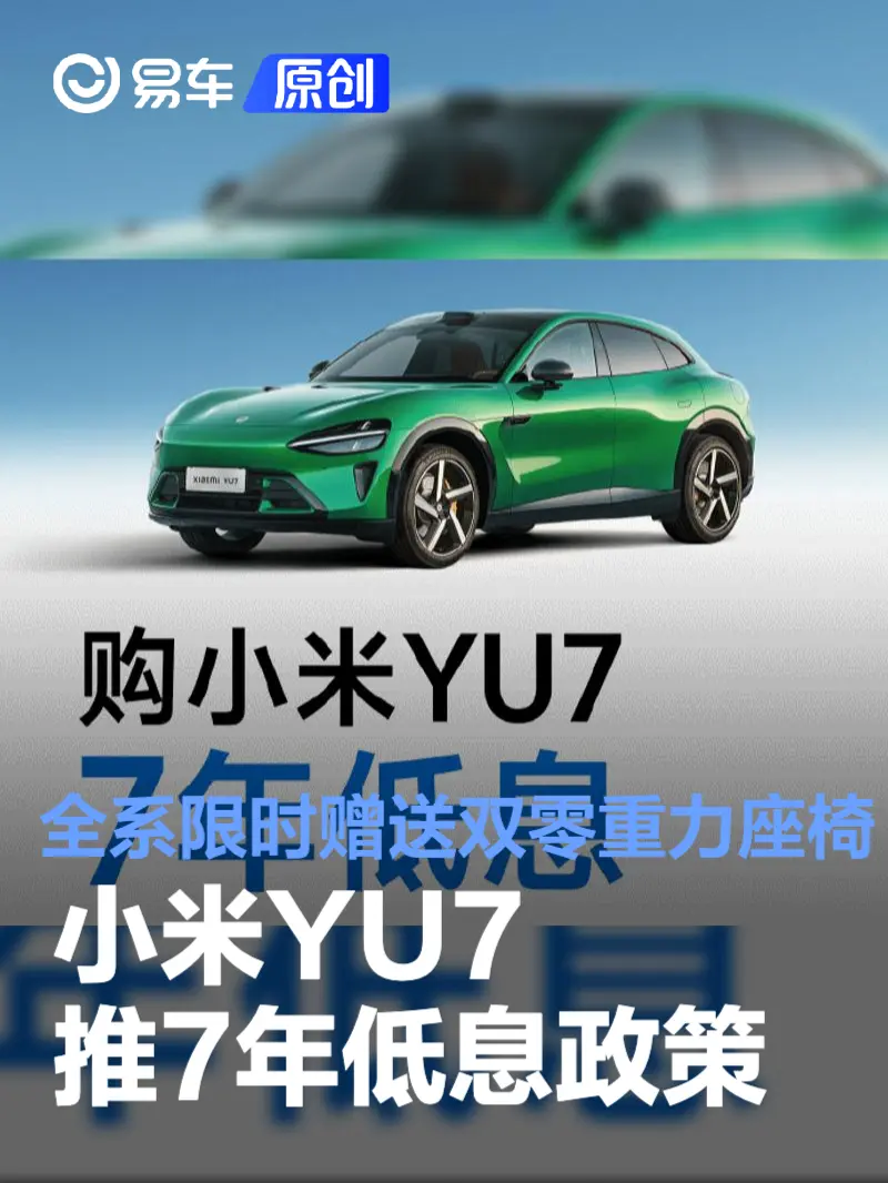 小米YU7推7年低息政策 全系限时赠送双零重力座椅 2026-01-15 20:46 来源:汽车产经网 作者:易车原创报道 举报 易车讯 1月15日,在雷军直播上,小米创办人,董事长兼CEO雷军宣布小米YU7推出7年低息。同时,还同步推出限时福利,全系赠送双零重力座椅。 据了解,1月16日0点开始,截至2月28日24点前,购买小米YU7可首付4.99万元起,月供低至2593元起。另有3年0息政策可选,首付7.49万元起,月供低至4961元起。 车主邀请好友小订并锁单新一代SU7,可获8000积分。