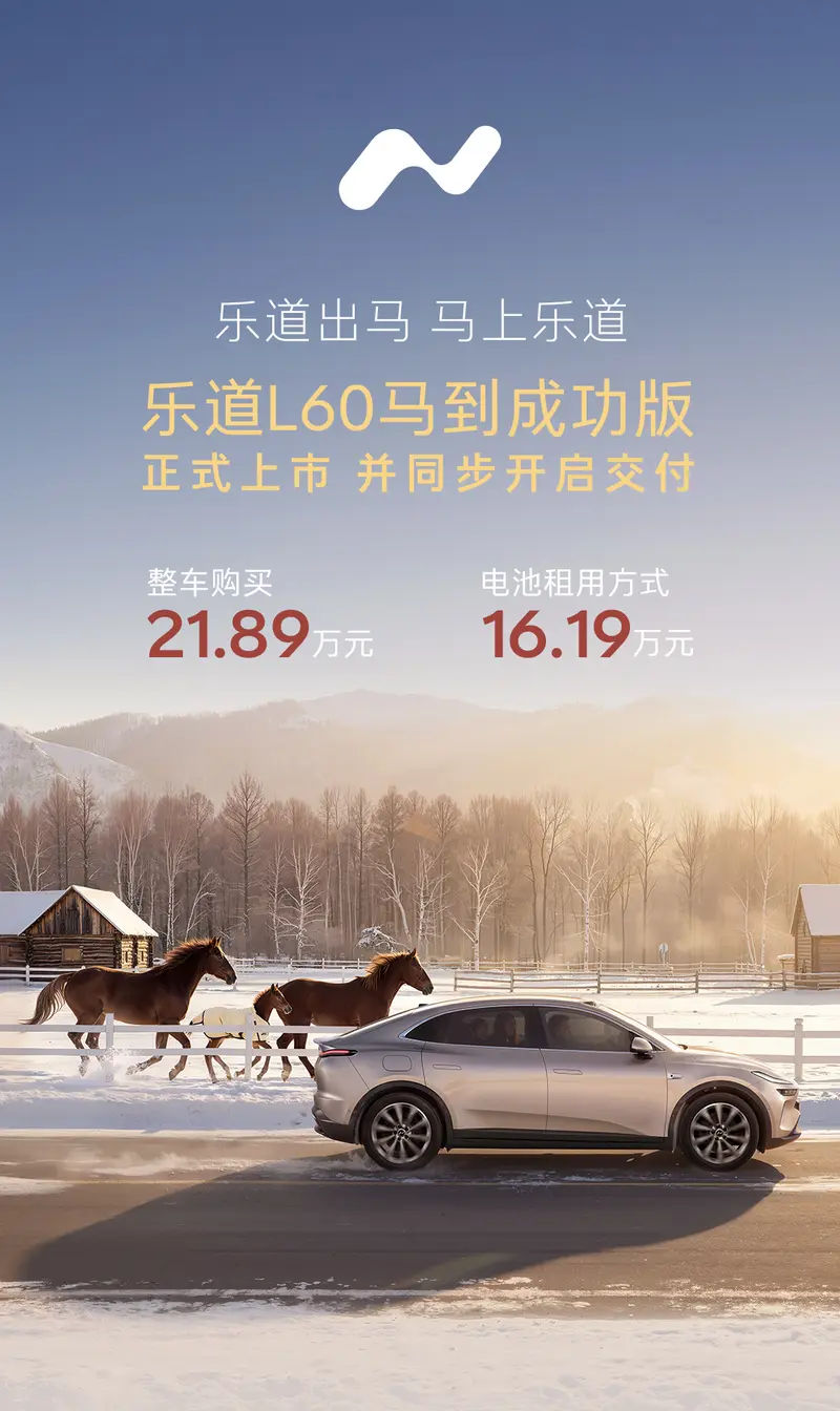 易车讯 1月16日,乐道汽车官方宣布L60马到成功版迎来正式上市,整车购买方案售价21.89万元,电池租用方案售价16.19万元。官方表示,新车将于今日同步开启交付。