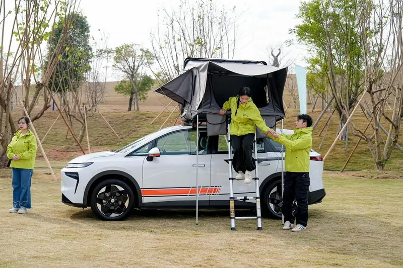 与此同时,车内座椅可放平形成2.5米纯平大床,与车顶帐篷组成“双层休憩空间”,轻松满足4—5人露营住在车上的需求。再加上遮阳帘、内置三个充电口等实用配置,进一步提升了露营场景的实用性与舒适度。