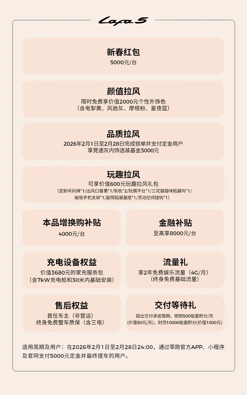 购Lafa 5可享受新春红包、免费享价值2000元个性外饰色、2026年2月1日至2月28日完成锁单并支付定金用户享竞速灰内饰选装基金3000元。还可享价值600元玩趣拉风礼包、本品增换购补贴4000元/台、金融补贴、充电设备权益、流量礼、售后权益、交付等待礼。