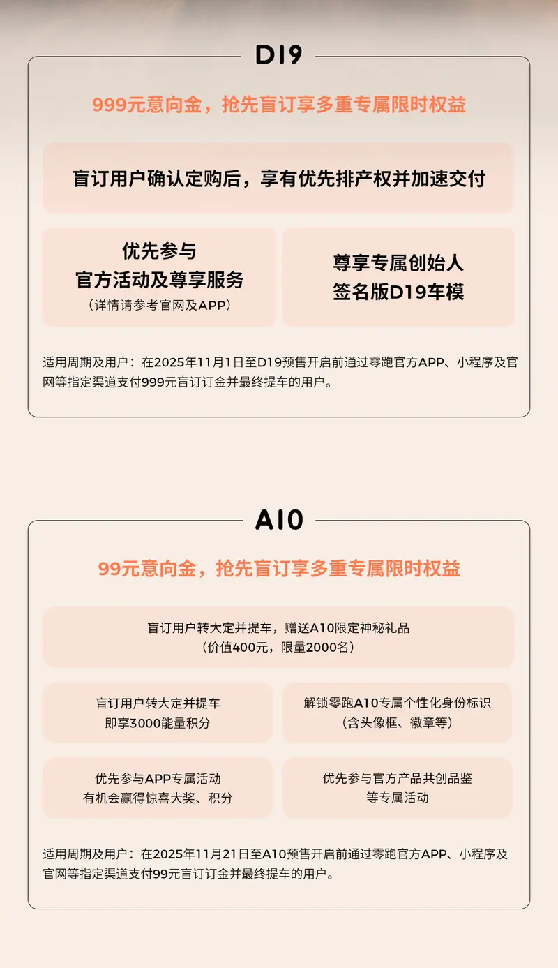 具体来看,零跑D19支付999元意向金,可享受多重专属限时权益。盲订用户确认订购后,享有优先排产权并加速交付,优先参与官方活动及尊享服务,尊享专属创始人签名版D19车模。