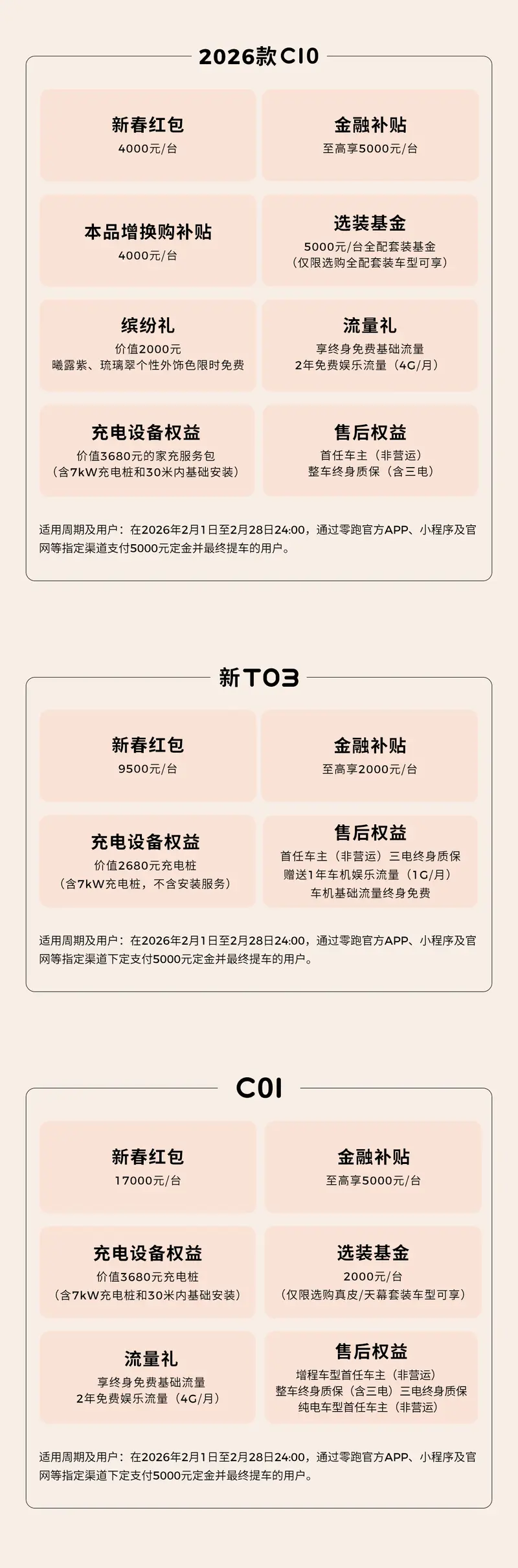 零跑B01和B10可享受新春红包、金融补贴、本品增换购补贴、缤纷礼、流量礼、充电设备权益等。