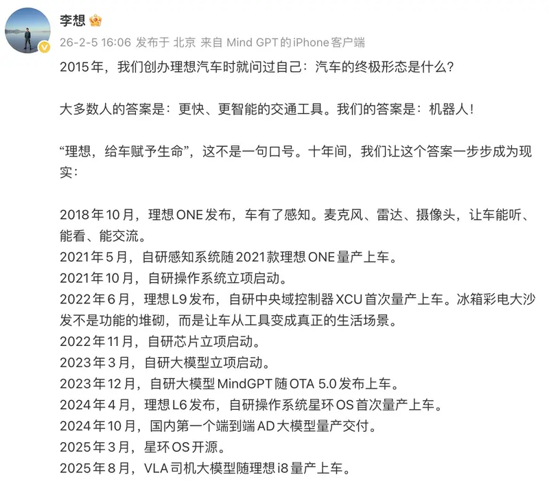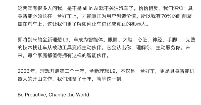 李想表示,2015年,我们创办理想汽车时就问过自己:汽车的终极形态是什么?大多数人的答案是:更快、更智能的交通工具。我们的答案是:机器人!李想还表示,这两年有很多人问我,是不是all in AI就不关注汽车了。恰恰相反,我们深知:具身智能必须长在一台好车上,才能真正为用户创造价值。所以我有70%的时间聚焦在汽车上,这让我们更了解如何让车进化成真正的机器人。