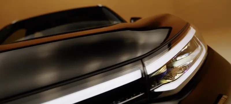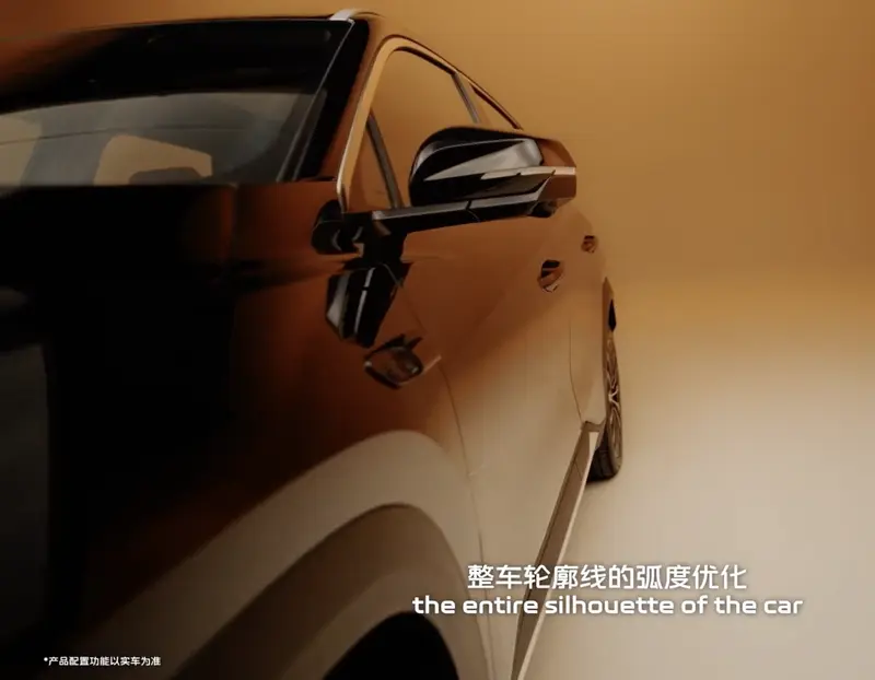 侧面来看,新车拥有非常立体的车身线条,并采用时下流行的悬浮车顶设计。设计团队还针对车鼻R角、D柱缩进等20余处细节进行了气动优化,在保证宽裕后排头部空间的同时,实现了0.27Cd的风阻。