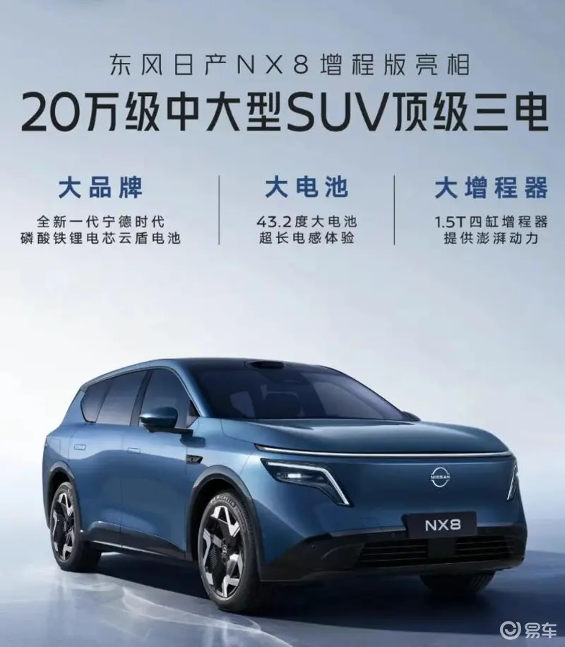 易车讯 2月7日,东风日产NX8增程版官图发布。作为东风日产打造的全新中大型SUV,NX8基于天演架构打造而来,提供纯电版及增程版以供消费者选择,其中NX8增程版搭载1.5T四缸增程器,配备43.2度宁德时代磷酸铁锂电池,预计新车将于今年二季度上市销售。