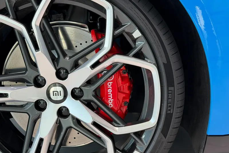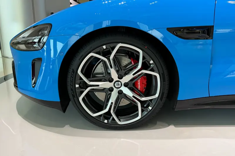侧面来看,新车延续了溜背式的动感造型,配合富有层次感的线条,带来很强的视觉冲击力。此外,新车搭载了全新造型的20英寸轮毂,并配备了红色刹车卡钳。官方表示,新一代小米SU7将全系标配前窄后宽轮胎(前245mm/后 265mm) 以及前四活塞固定卡钳。