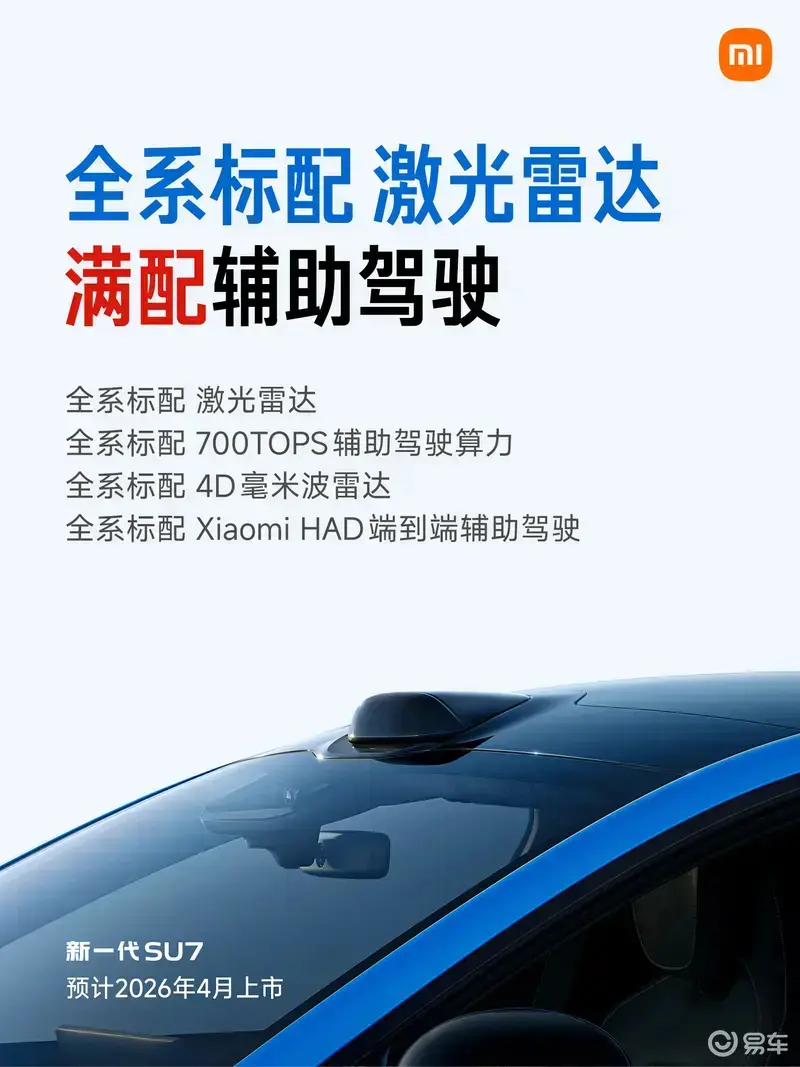 智能驾驶辅助方面,新一代SU7辅助驾驶硬件规格全面升级,入门即满配。全系标配激光雷达和4D毫米波雷达,配合700TOPS算力的旗舰芯片,实现全天候、全场景的精准环境识别。无论在暗光、雨雾等复杂天气条件下,还是面对遮挡物、行人穿行等复杂场景,系统均能快速响应,稳定追踪,显著提升行车安全性与驾驶体验。