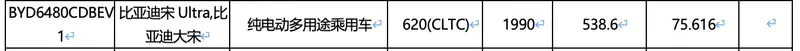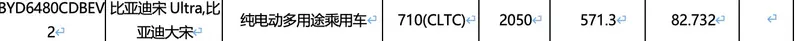 易车讯 日前,我们在工信部最新一期减免车辆购置税的新能源汽车车型目录中发现了比亚迪宋Ultra EV车型的电池及续航信息,该车搭载75.616kWh、82.732kWh两种容量的电池组,CLTC续航里程分别为620km和710km。据悉,比亚迪宋Ultra EV将于一季度正式上市。