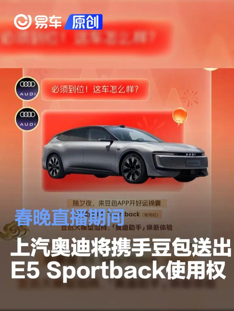 易车讯 2月10日,上汽奥迪官方宣布携手豆包在2月16日春晚直播期间,用户只需打开豆包APP,参与抽奖互动,即有机会赢取奥迪 E5 Sportback使用权。