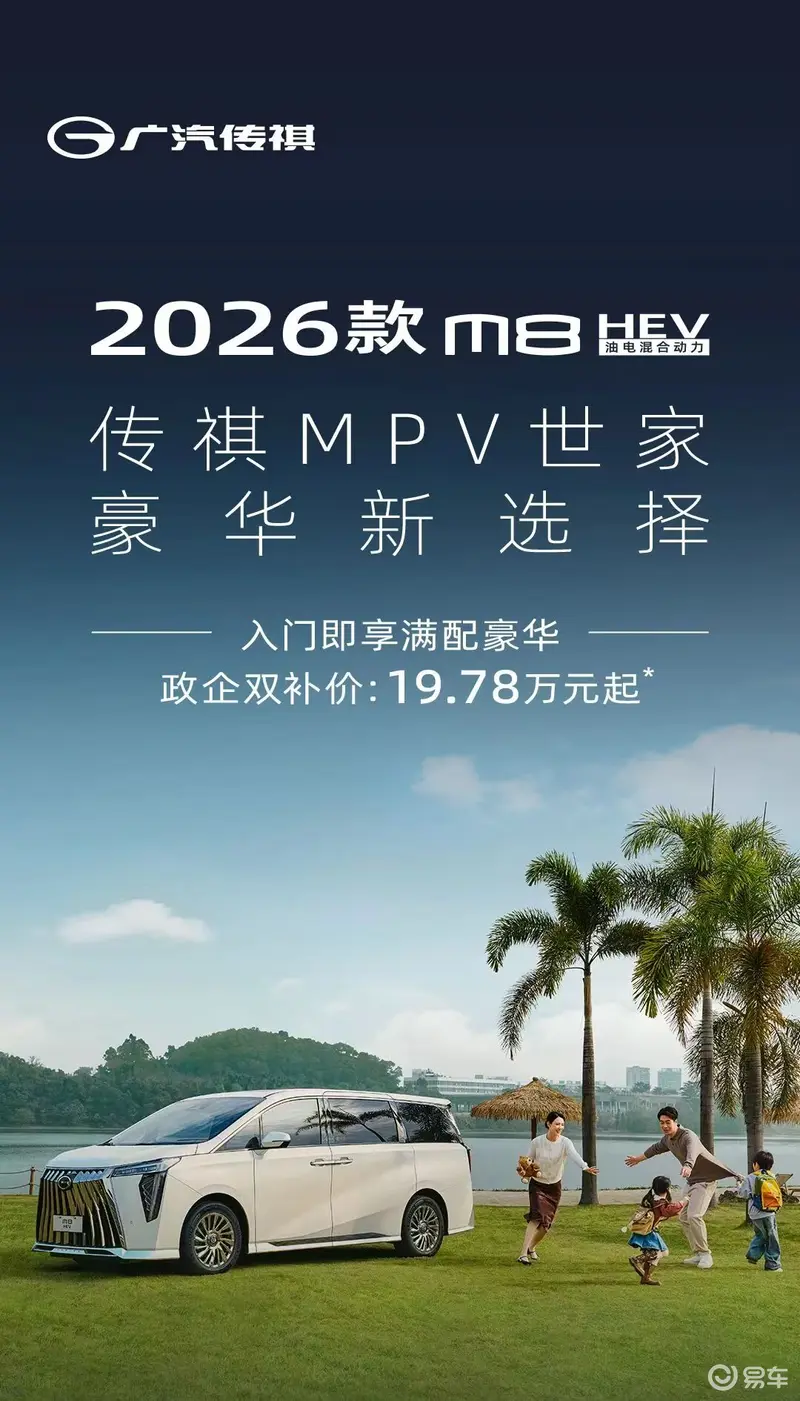易车讯 2月23日,广汽传祺2026款M8 HEV正式上市,售价21.98-23.98万元,叠加国家以旧换新补贴及厂家焕新置换礼补贴后,政企双补价19.78-21.78万元。作为年度改款车型,新车在设计上与现款车型保持一致,主要对配置进行一定升级。