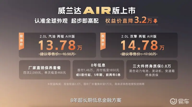⼴汽丰⽥推出⾏业⾸创⼚家直销保养套餐,仅需2099元即可享受4次原⼚保养。全新换代威兰达提供⼚家兜底的终⾝质保,发动机、变速箱、动⼒电池全部⼚家免费质保。针对市⾯上主推的7年低息购⻋⽅案,全新换代威兰达推出更⻓的8年超⻓期低息⾦融⽅案,⾸付只需1.4万元,⽉供仅需1600元,购⻋⻔槛历史新低。同时推出5年低息⾦融政策,0⾸付,前两年0息购⻋。