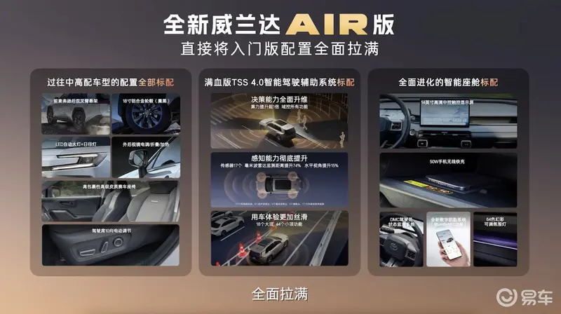 易车讯 2月24日,广汽丰田宣布全新威兰达AIR版正式上市。全新换代威兰达Air版下订即享现⾦优惠2.2万元,再加上国补、⼚补1万元,权益直降3.2万元。2.0L汽油AIR版最终权益价13.78万元;2.0L混动AIR版最终权益价14.78万元。
