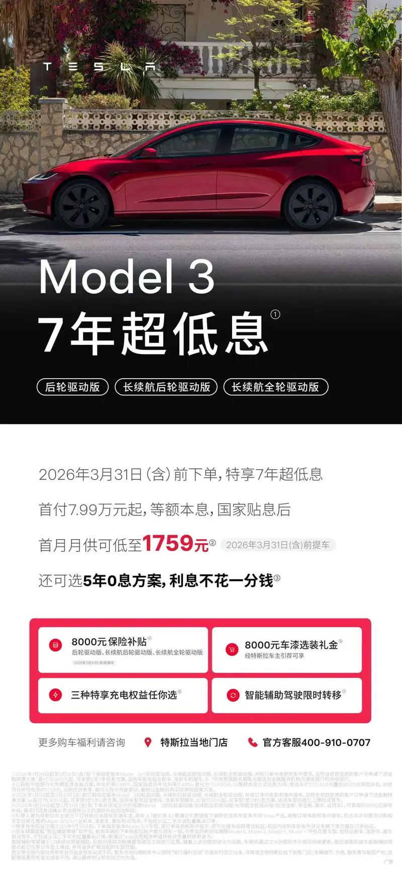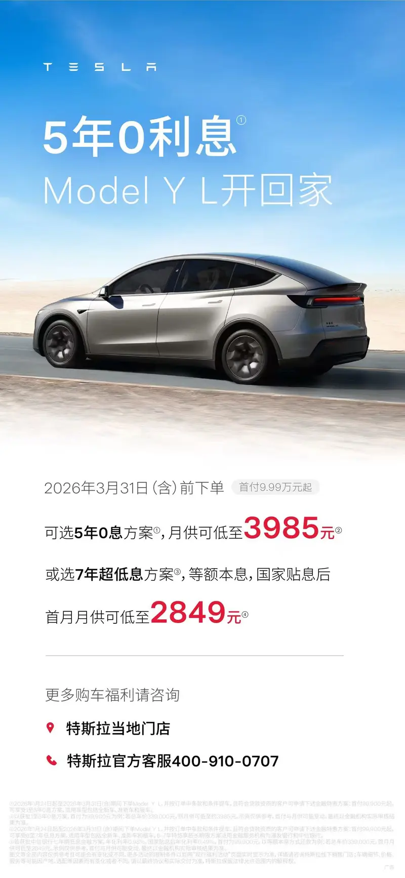 特斯拉公布最新销售政策 Model3/Y可享7年超低息 2026-02-26 09:24 来源:汽车产经网 作者:易车原创报道 举报 易车讯 2月26日,特斯拉官方公布最新销售政策,2026年3月31日(含)前下单,可享受7年超低息+国家贴息。此外,Model 3和Model Y可享受7年超低息或5年0利息。 具体来看,2026年3月31日(含)前下单,Model 3后轮驱动版、长续航后轮驱动版、长续航全轮驱动版首月月供可低至1759元,Model Y后轮驱动版、长续航后轮驱动版、长续航全轮驱动版首月月供可低至2188元;Model Y L首月月供可低至2849元。