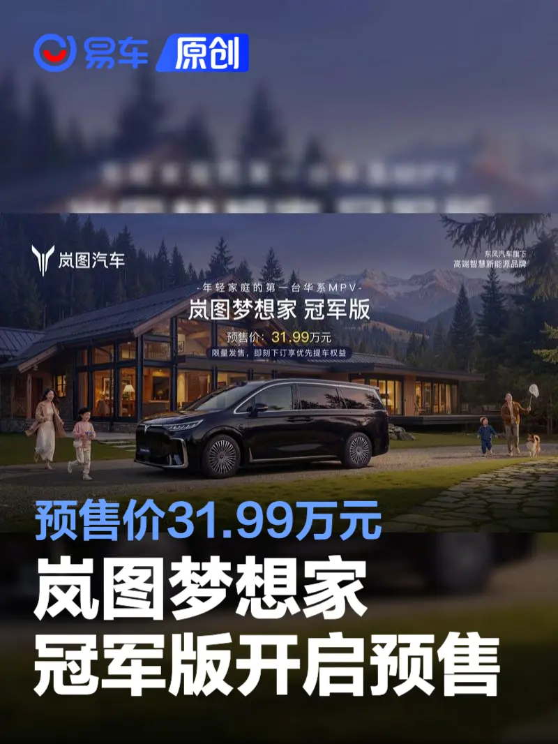 易车讯 3月1日,岚图梦想家限量推出梦想家冠军版,新车预售价31.99万元。岚图梦想家将于本月迎来第20万辆整车下线,为纪念这一里程碑时刻推出冠军版。新车将于本月迎来上市。