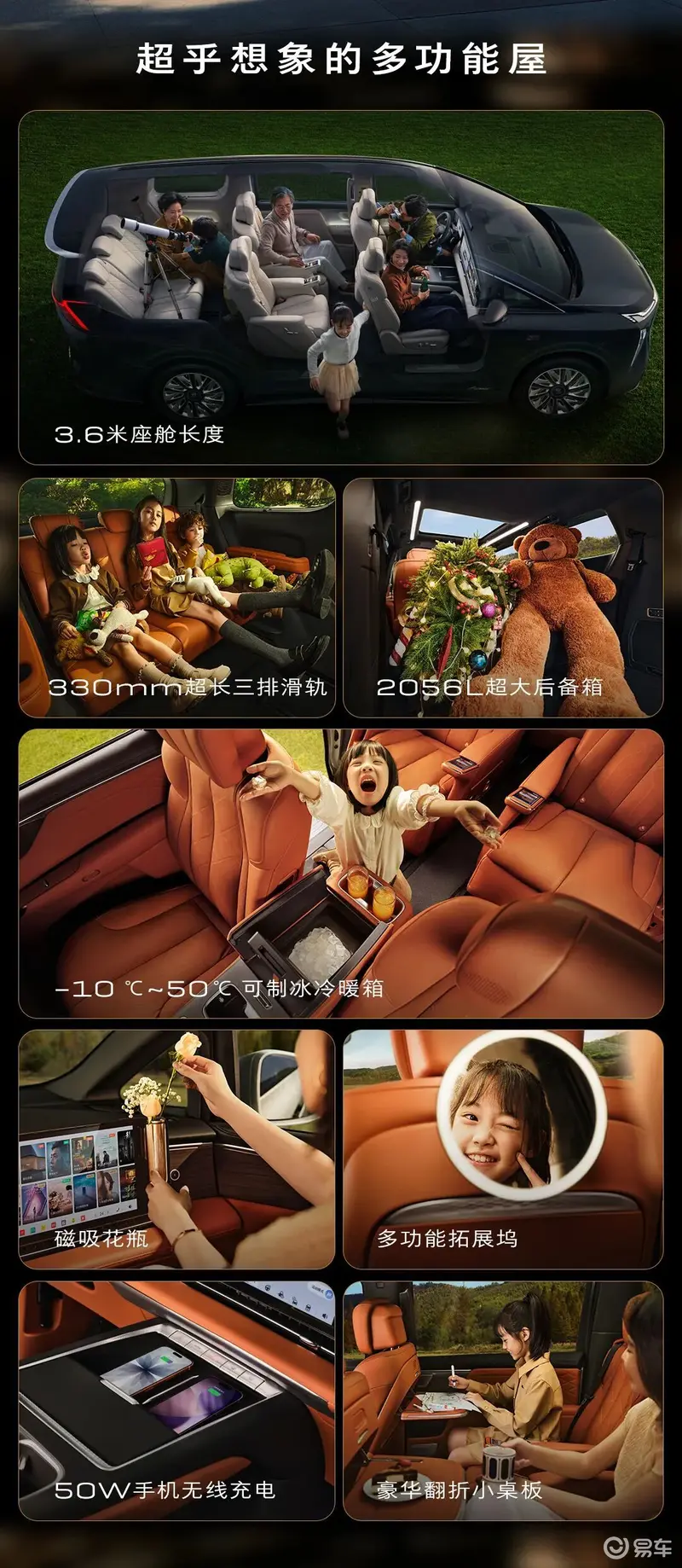 其余配置方面,新车搭载全舱联动迎宾模式以及云台式超低礼宾空悬,礼宾空悬支持该车前后同步平稳下降60mm,进一步提升上下车便利性。座椅方面,新车二排配备330mm电动滑轨,支持智能一键多场景空间布局,即使在满员的情况下后备厢依然可容纳2个24寸+13个20寸行李箱。