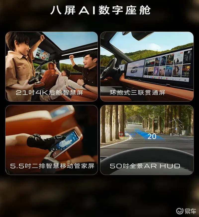 内饰方面,新车搭载高通8775芯片,支持50英寸全景AR-HUD、21英寸4K后舱多媒体智慧屏、二排双5.5英寸智慧移动管家屏、中控屏、副驾屏等在内的8屏互动,科技感拉满。值得一提的是,新车搭载的二排OMS摄像头支持手势控车及乘员状态监测,同时还能联动智慧场景模式,主动提供场景服务。新车搭载强大的AI大模型语音助手,可支持完成700项车控指令。