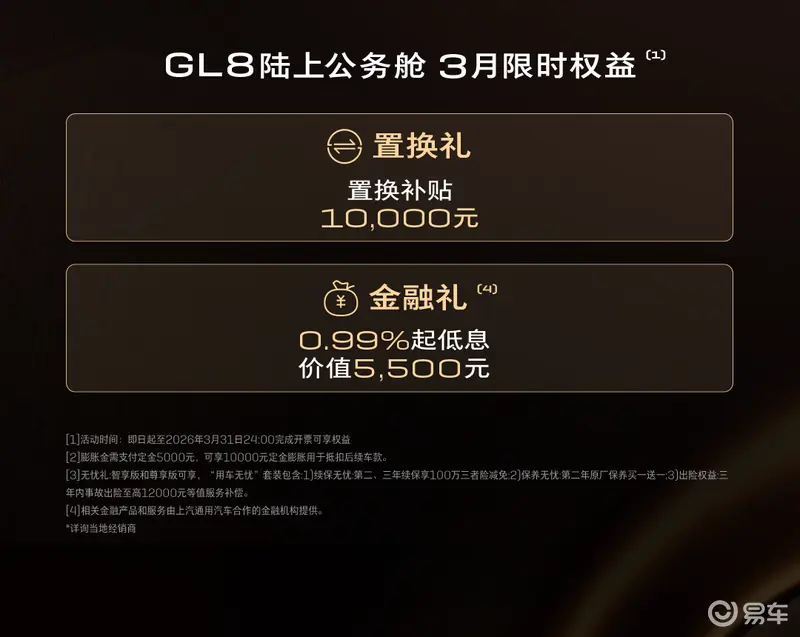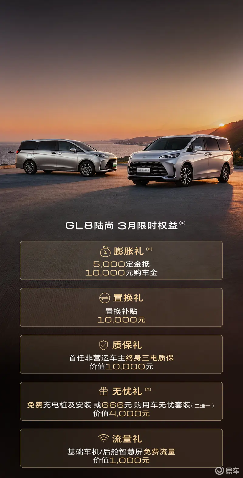 官方还同步推出GL8陆尚以及GL8陆上公务舱3月限时权益,GL8陆尚可享5000元定金抵10000元购车金;置换补贴10000元;价值10000元的首任非营运车主终身三电质保;价值4000元的免费充电桩及安装或666元购用车无忧套装(二选一);价值1000元的基础车机/后舱智慧屏免费流量。GL8陆上公务舱可享置换补贴10000元以及0.99%起低息金融方案。