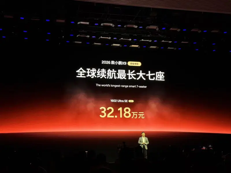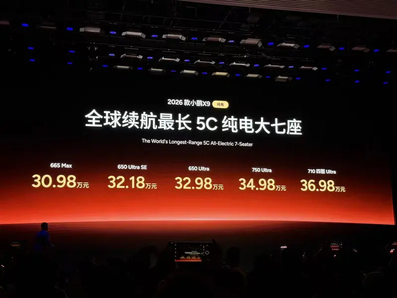 易车讯 3月2日,小鹏汽车官方宣布2026款小鹏X9纯电版迎来正式上市,新车共推出5款车型,售价区间30.98-36.98万元。新车全系标配800V高压平台+5C超充AI电池,最高CLTC纯电续航提升至750km。同时,官方还针对小鹏X9超级增程加推1602 Ultra SE版本,售价32.18万元。