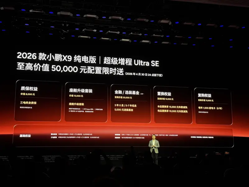 即日起至2026年4月30日24点(含)前下定2026款小鹏X9纯电版,可享最高价值50,000元 权益限时送,包含三电终身质保、价值12,000元的座舱升级套装、至高价值30,000元金融/选装基金、至高价值15,000元置换权益以及每年1500度电卡(6年)的复购权益。2026款小鹏X9超级增程权益与2026款纯电版权益一致(2026年3月31日24:00前下定)。此外24和25款的X9车主置换26款X9可以获得额外1万元的代金券补贴。(2025年11月20日已发放)还有早鸟权益限时返场,3月2日22点(含)前下定全车系,可享受2000元抵7000元购车款权益。