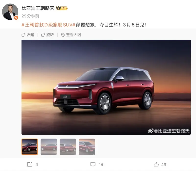 易车讯 3月3日,比亚迪王朝网销售事业部总经理路天在社交媒体上发布了王朝首款D级旗舰SUV大唐官图,并宣布该车将于3月5日正式亮相。