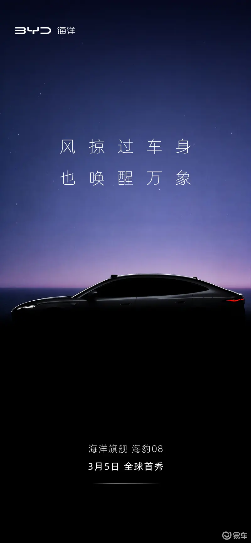 易车讯 3月3日,比亚迪发布海洋网全新旗舰轿车海豹08预告图,并宣布该车将于3月5日正式发布。新车延续比亚迪Ocean-S概念车的设计语言,将搭载兆瓦闪充、后轮转向、第二代刀片电池等诸多比亚迪最新技术。
