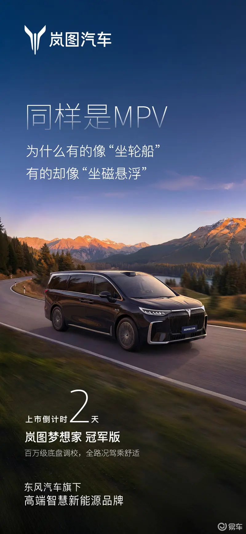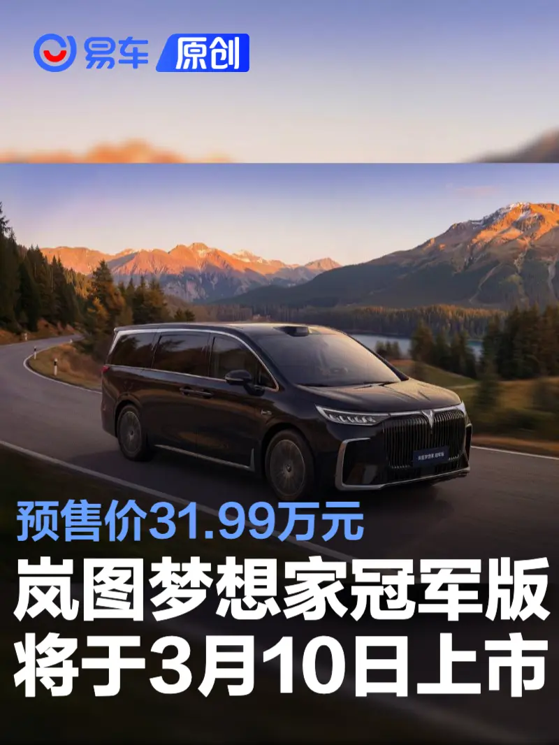 岚图梦想家冠军版将于3月10日上市 预售价31.99万元 2026-03-08 12:43 来源:汽车产经网 作者:易车原创报道 举报 易车讯 今日,我们从官方获悉,岚图梦想家冠军版将于3月10日上市,新车预售价31.99万元。届时,岚图梦想家第20万辆整车亦将迎来正式下线。 外观方面,新车整体与现款车型差别不大,但采用了更加个性化的曜黑格栅,与玄英黑车色相辅相成,气场与力量感凸显。 配置方面,新车搭载华为乾崑智驾ADS4和鸿蒙座舱5,拥有百万级底盘体验和智能四驱。