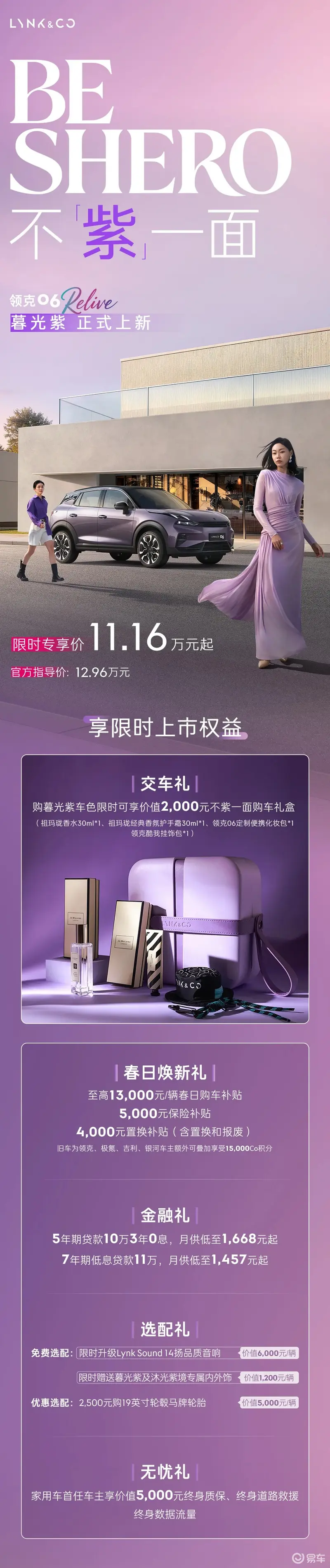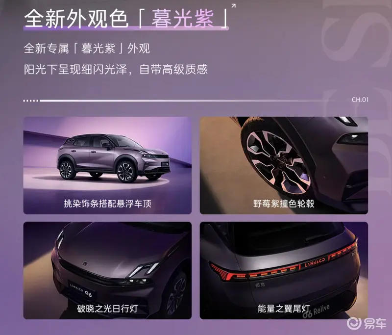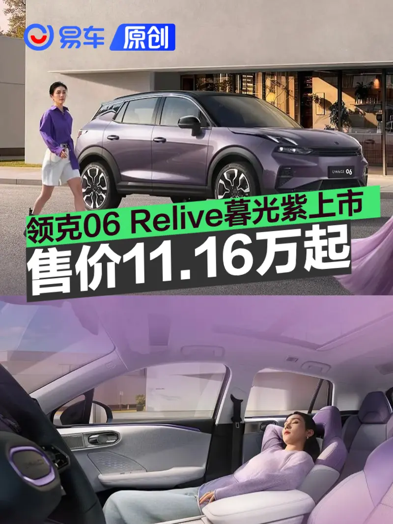 易车讯 近日,领克06 Relive暮光紫正式上市。官方指导价12.96万元,限时专享价11.16万元起。新车增加暮光紫车色及沐光紫境内饰,选装价1200元,限时免费赠送。