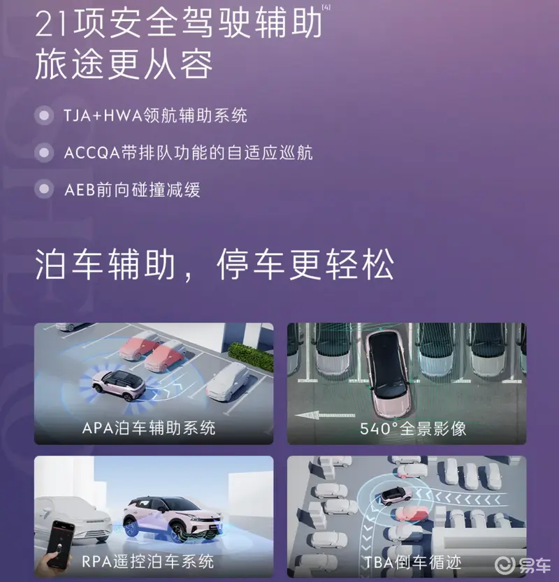 智能驾驶方面,新车拥有APA泊车辅助系统,540度全景影像,RPA遥控泊车系统,TBA倒车循迹。21项安全驾驶辅助,可使旅途更从容。