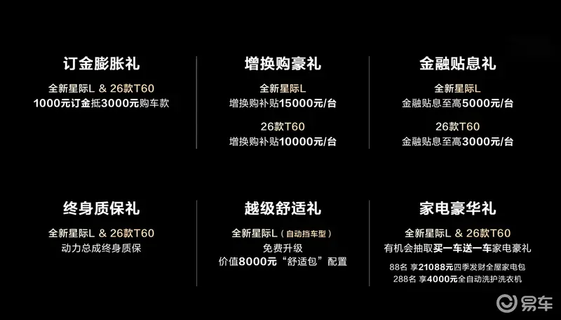 预售专属权益方面,全新星际L享15000元/台补贴,26款T60享10000元/台补贴;金融贴息礼同步上线,星际L至高5000元/台,T60至高3000元/台,大幅降低购车门槛。更值得一提的是,两款新车搭载的柴油发动机均享动力总成终身质保。