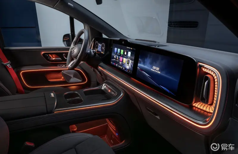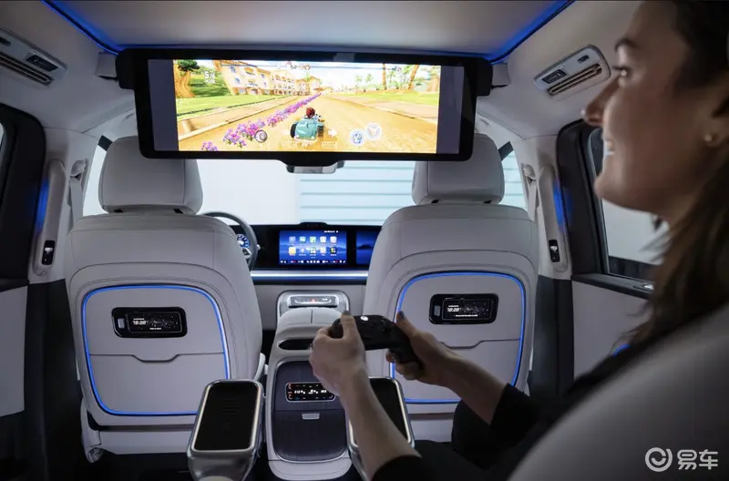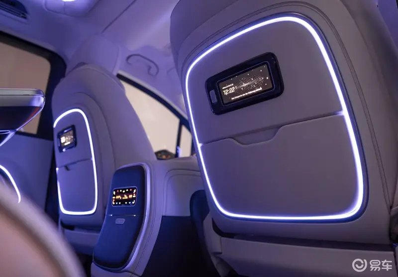 新车中控台搭载10.25英寸仪表屏、14英寸中央显示屏及14英寸前排乘客显示屏,后排配备了31.3英寸8K全景屏,可灵活分屏显示,并配备800万像素摄像头。只需一句“你好,奔驰,开启影院模式”,巨幕便会自车顶缓缓滑出,同时全车电动遮阳帘同步闭合。配合支持杜比全景声的Burmester3D环绕立体声音响系统及整体式音效系统,全舱乘员皆可沉浸于由22个扬声器构筑的沉浸式声场。