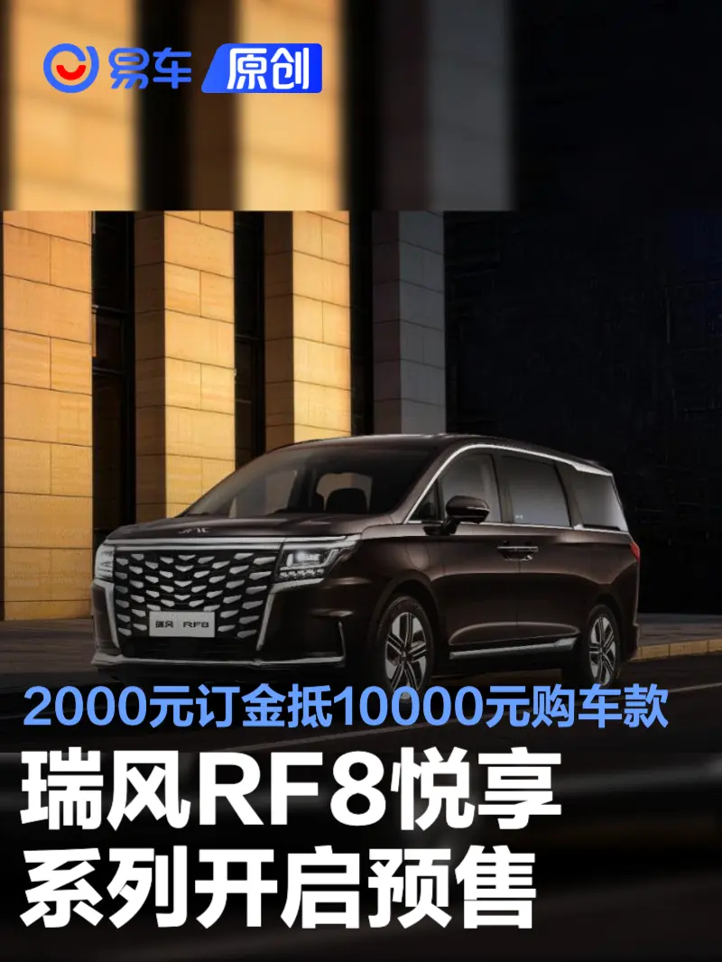 易车讯 日前,江汽集团宣布瑞风RF8悦享系列开启预售,悦享升级价值32888元。即日起至上市前,用户通过江淮瑞风APP或官方小程序支付2000元订金,并在上市后48小时内完成配置选定及锁单,即可享受2000元抵10000元购车款。