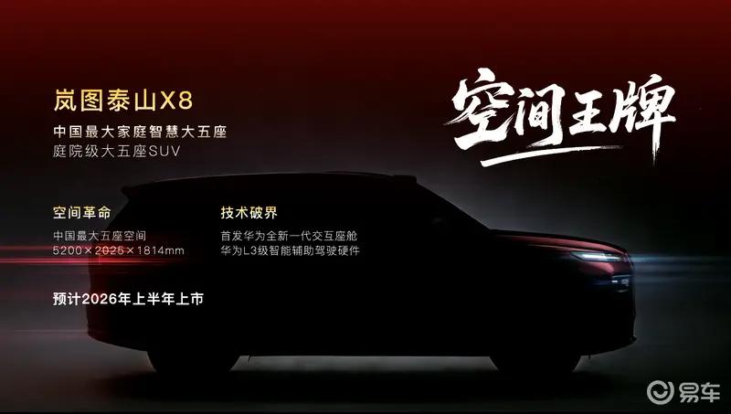 结合此前官方公布的消息,岚图泰山X8长宽高为5200×2025×1814mm,预计将于2026年上半年正式上市。