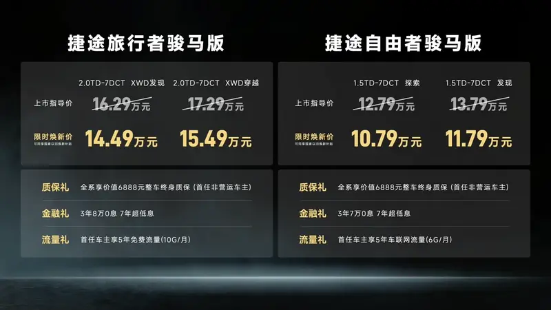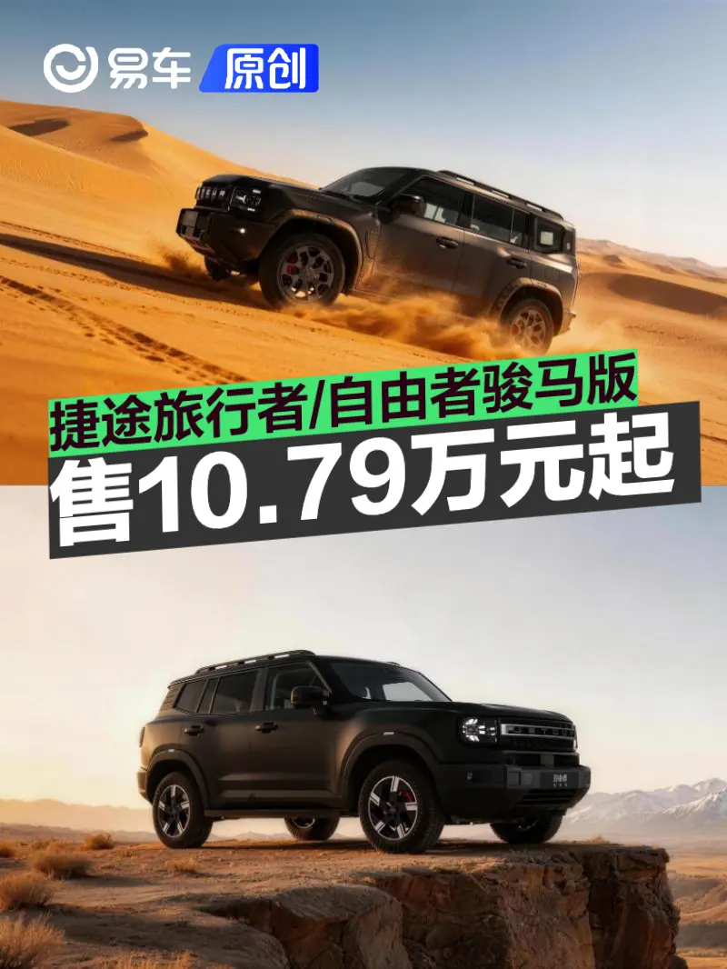 易车讯 3月11日,捷途汽车官方宣布旅行者骏马版和自由者骏马版迎来正式上市,其中捷途旅行者骏马版共推出2款车型,售价区间16.29-17.29万元,限时焕新价14.49-15.49万元;捷途自由者骏马版共推出2款车型,售价区间12.79-13.79万元,限时焕新价10.79-11.79万元。同时,两款车型推出质保礼、金融礼、流量礼。两款车型作为特别版,采用了黑哑光车漆和黑化车标。
