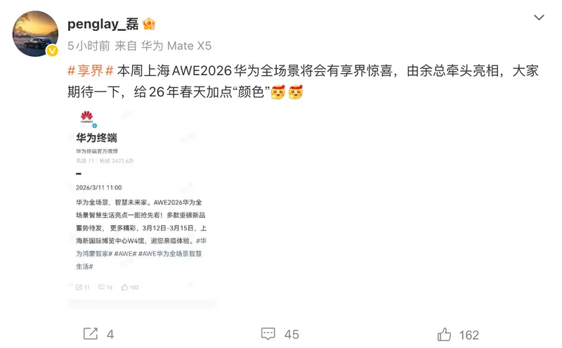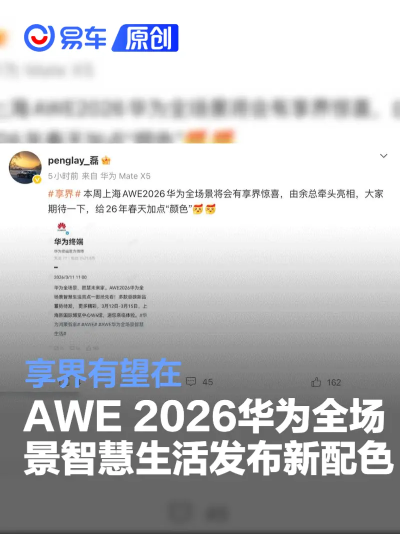 易车讯 3月12日,华为智选车享界系列产品总监彭磊在微博上表示,本周上海AWE2026华为全场景将会有享界惊喜,由余总牵头亮相,大家期待一下,给26年春天加点“颜色”。有消息表示,此次的惊喜预计是指享界S9系列汽车将推出全新车漆色。