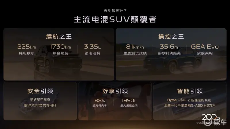 易车讯 3月13日,吉利银河M7正式亮相。作为吉利银河M系列首款中级电混SUV,新车拥有225km的纯电续航以及1730km的综合续航,将于上半年正式上市。