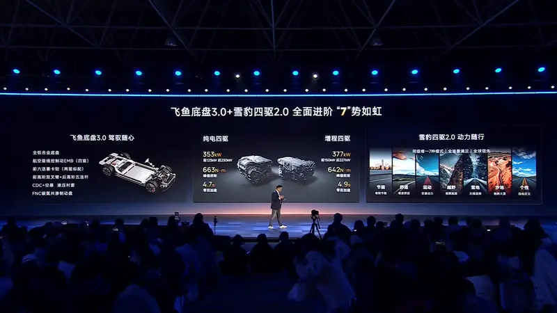 动力方面,增程版车型搭载1.5T增程系统,发动机最大功率115千瓦,动力电池容量分别为39.816kWh/39.9168kWh,纯电续航里程分别为182km/203km;纯电车型采用双电机,前电机最大功率123千瓦,后电机最大功率230千瓦,搭载97.682kWh电池,续航里程分别为682km/726km。