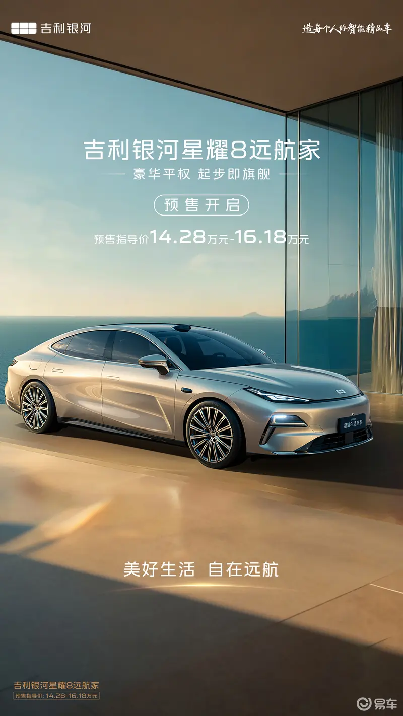 易车讯 今日,吉利银河旗下中高级插混轿车旗舰——吉利银河星耀8“远航家”正式开启预售,推出225km EM-i远航家航海版、225km EM-i远航家远洋版、225km EM-i远航家星河版三个版型,预售指导价14.28-16.18万元。此外,含“重磅礼、订金礼、无忧至臻礼、限时选装礼、先享交车礼”在内,共计五大项预售权益也将同步上线。