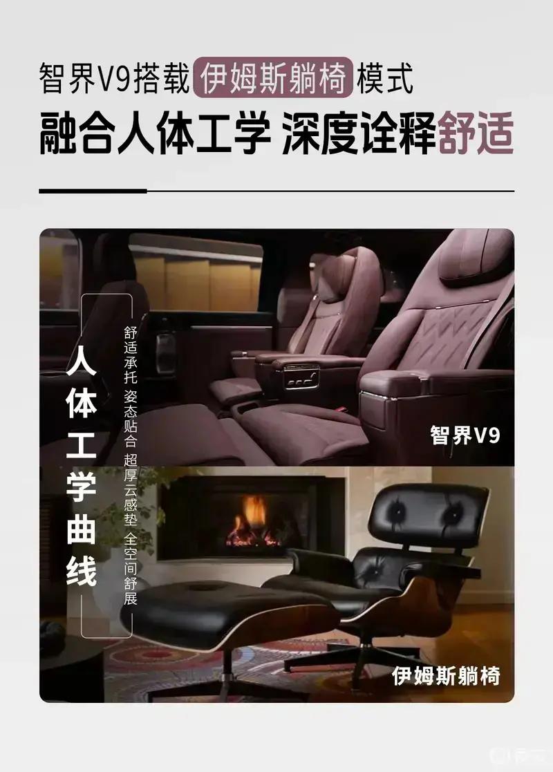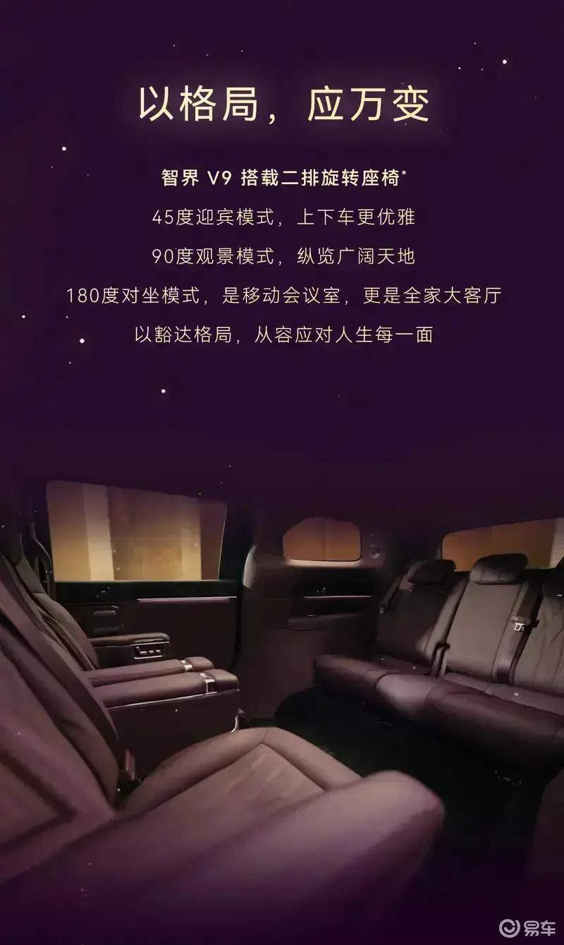 智界V9首发绒霞紫内饰,选用天然实木、NAPPA头层真皮与晶钻切工水晶等高端材质,豪华质感拉满。此外,新车还搭载二排旋转座椅、太空舒躺模式及零重力座椅模式等智能科技配置。