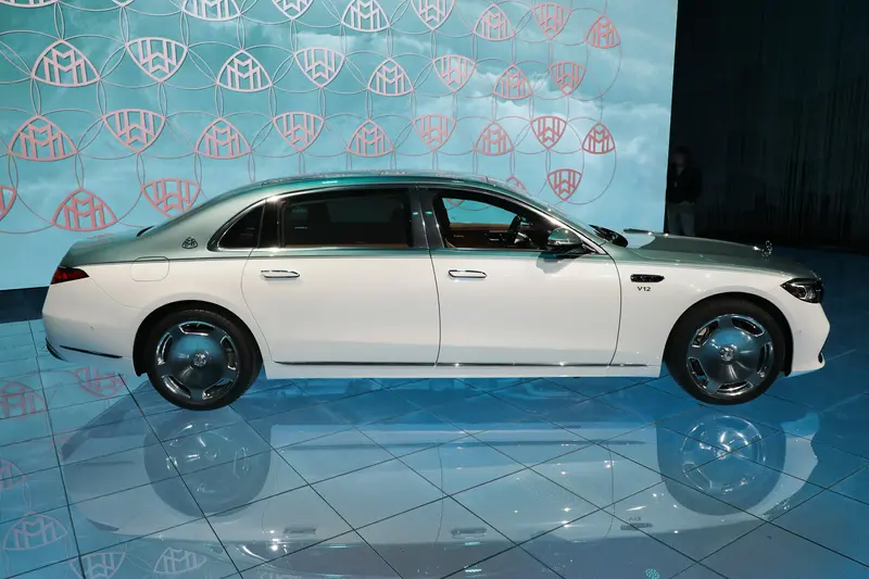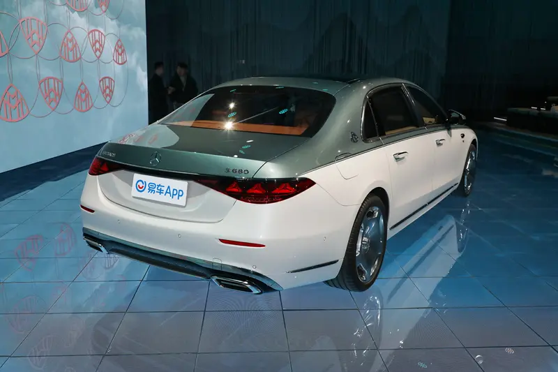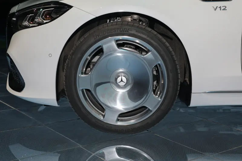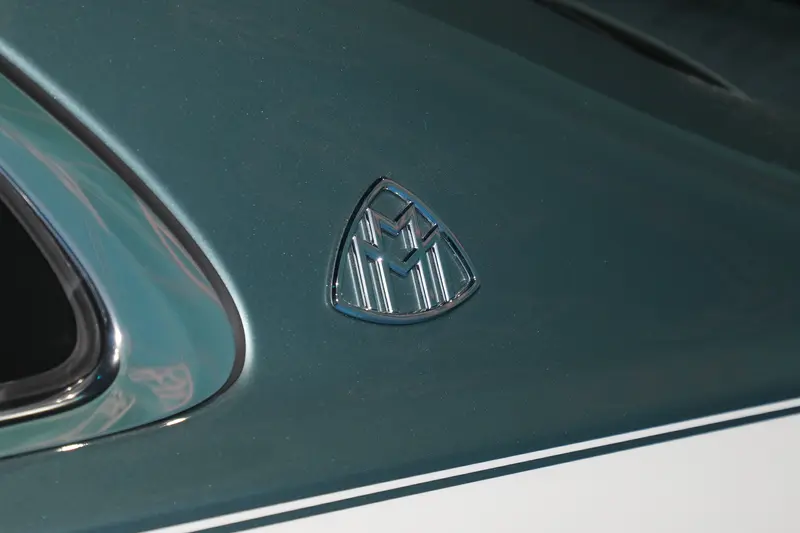 车身侧面,新车在车侧迎宾踏板集成投影装置,在迎宾与送别时刻,将“MAYBACH”字样投映于地面。新增全新20英寸多辐锻造轮毂与21英寸金色MANUFAKTUR定制轮毂;所有银色锻造轮毂中心饰以悬浮式三叉星徽,凭借精密的滚珠轴承结构,无论车轮如何转动,星徽始终昂然正立。