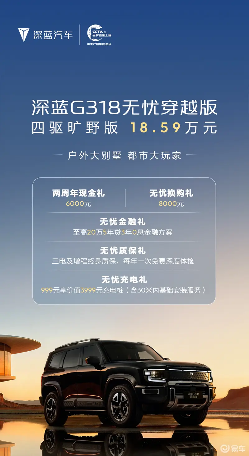 易车讯 3月25日,深蓝汽车宣布深蓝G318新增无忧穿越版车型,售价18.59万元。新车上市的同时官方还推出丰富的购车权益,包含6000元现金礼、8000元换购礼、至高20万5年贷3年0息金融方案、三电及增程终身质保,每年一次免费深度体检以及799元享价值3999元充电桩(含30米内基础安装服务)。