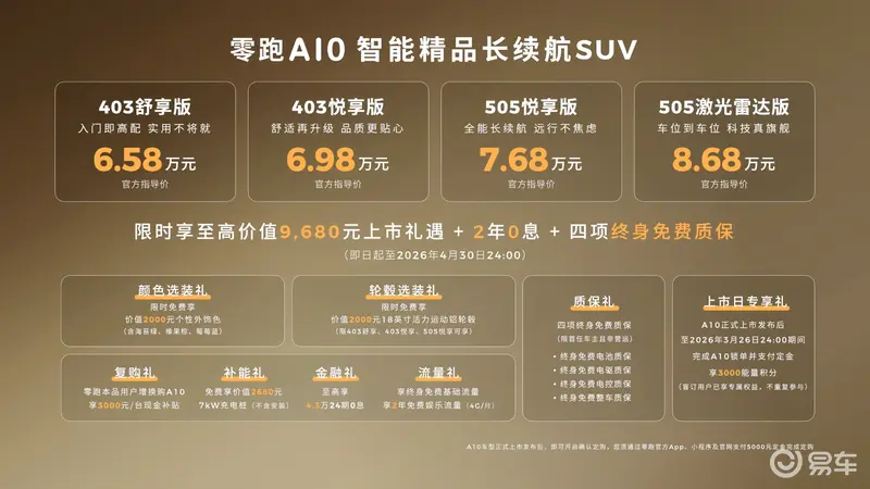 易车讯 3月26日,零跑A10正式上市,包含四款车型,售价区间6.58-8.68万元。即日起至2026年4月30日24:00,限时享至高价值9680元上市礼遇+2年0息+四项终身免费质保。零跑A10定位一款小型SUV,外观采用家族化设计语言。此外,新车还搭载SA8295座舱芯片及SA8650辅助驾驶芯片。零跑A10采用纯电驱动,CLTC纯电续航里程分别为403km和505km。